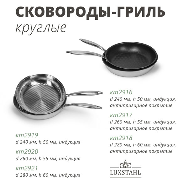 Сковороды круглые с рифленым дном диаметром 240 мм, 260 мм, 280 мм, а так же сковороды для рыбы с антипригарным покрытием, сковороды-пароварки с перфорированной вставкой, прямоугольные сковороды.